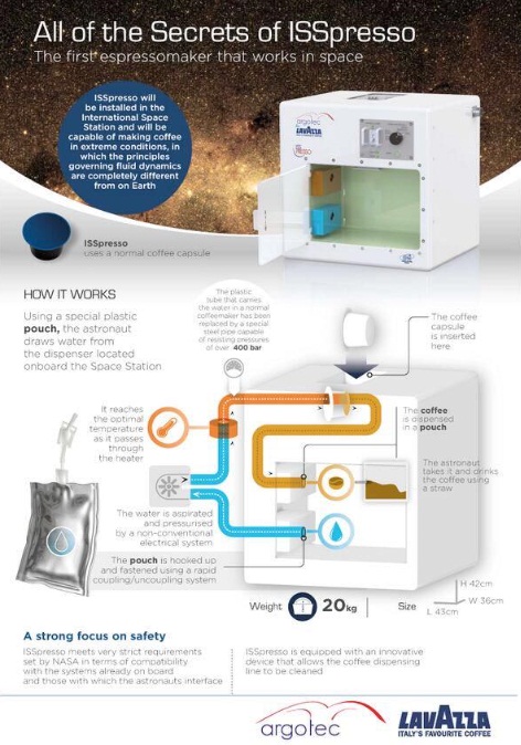 盡管在地球上泡咖啡是一件非常簡單的事情,但是在太空上要做到這一點(diǎn)就需要特殊的機(jī)器來應(yīng)付零重力帶來的問題。這個(gè)名為ISSpresso的太空咖啡壺是由意大利的Lavazza公司和Develped Argotec公司與意大利航天局(ASI)合作開發(fā)的,是意大利航天局專為Samantha Cristoforetti的太空之行選擇的九個(gè)實(shí)驗(yàn)之一。